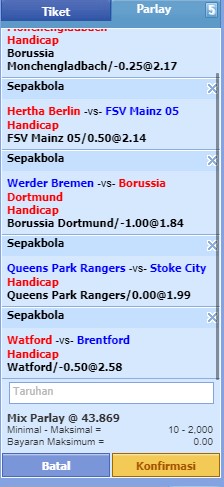 Namun, tentu sangat tidak mudah untuk bisa berhasil meraih Jackpot Mix Parlay ini, karena kita harus menebak Liga Bola dengan benar minimal Bet Mix Parlay 2 Team Dan Seterusnya untuk bisa meraih kemenangan.Menang Berapa Pun akan di Bayar hanya ada di Maxbet268.